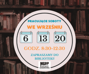 Drodzy Czytelnicy we wrześniu wracają sobotnie dyżury w bibliotece. Poniżej zamieszczamy harmonogram. Zapraszamy