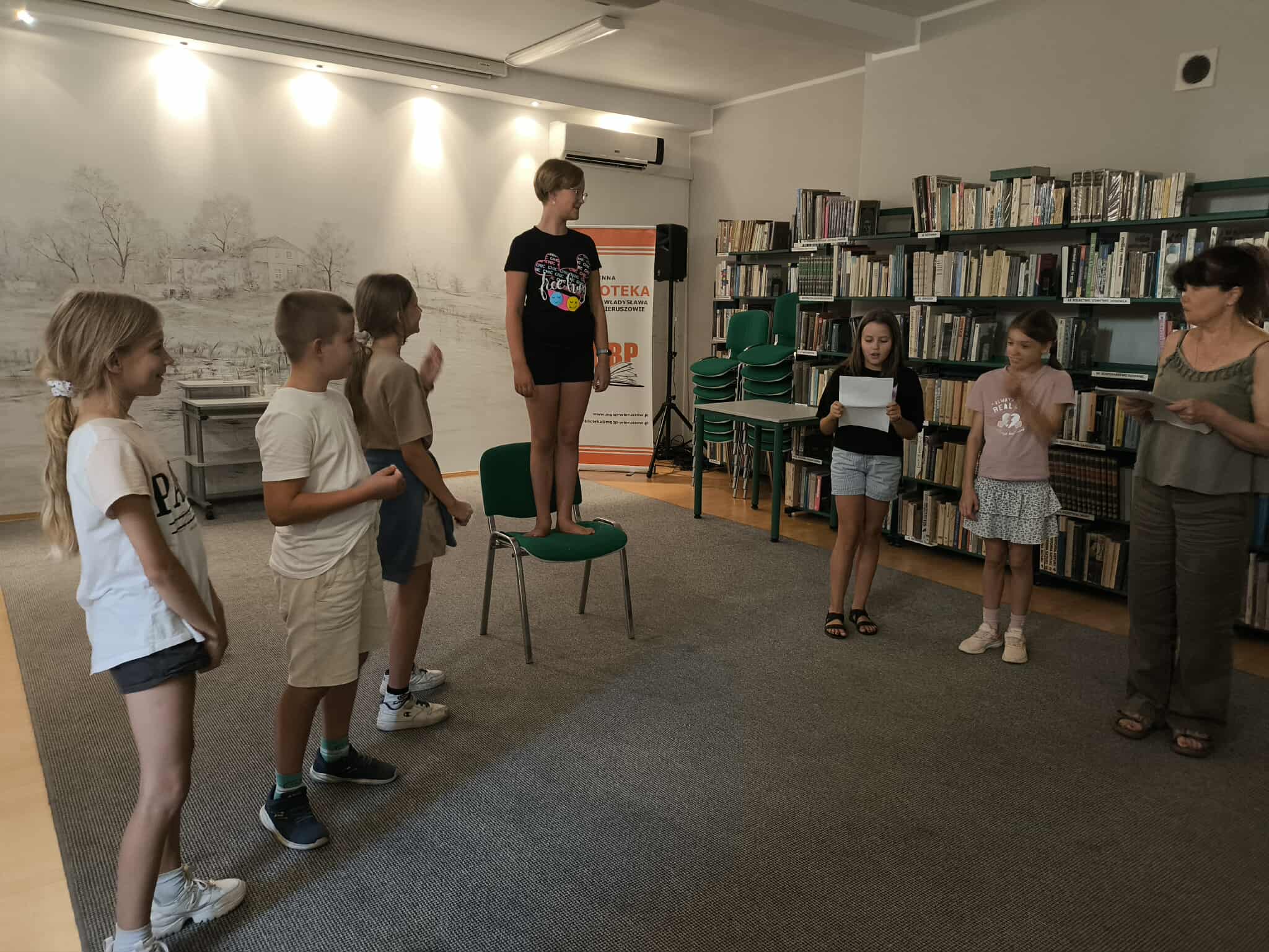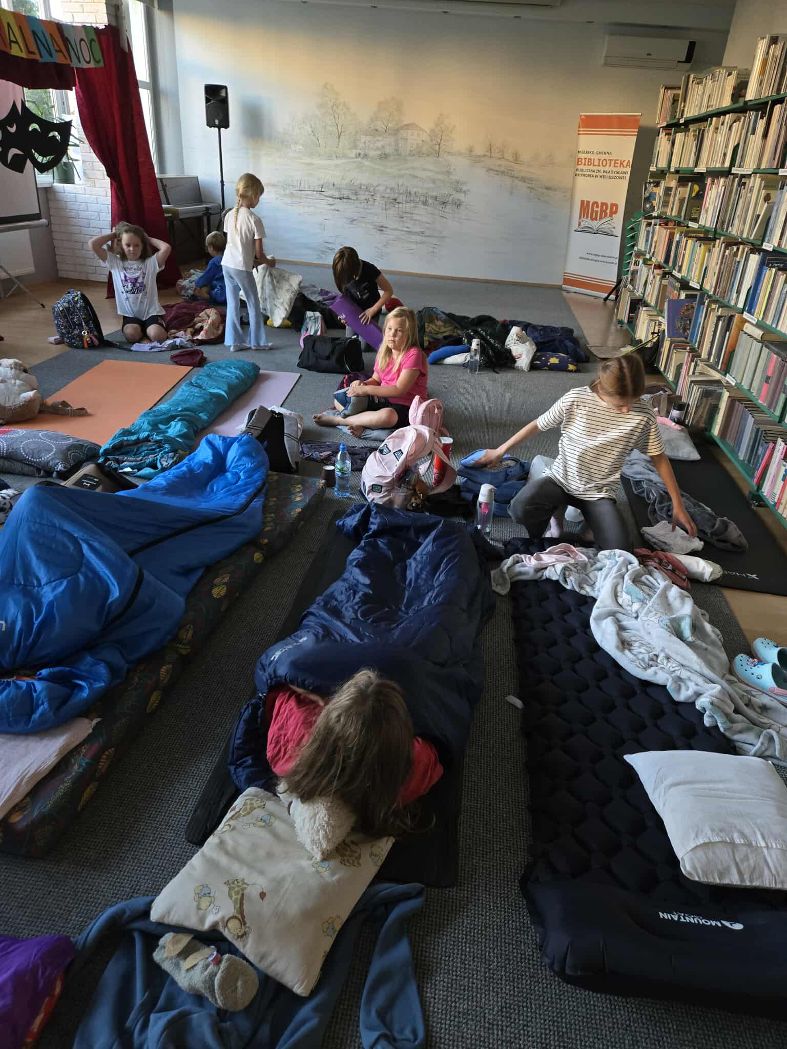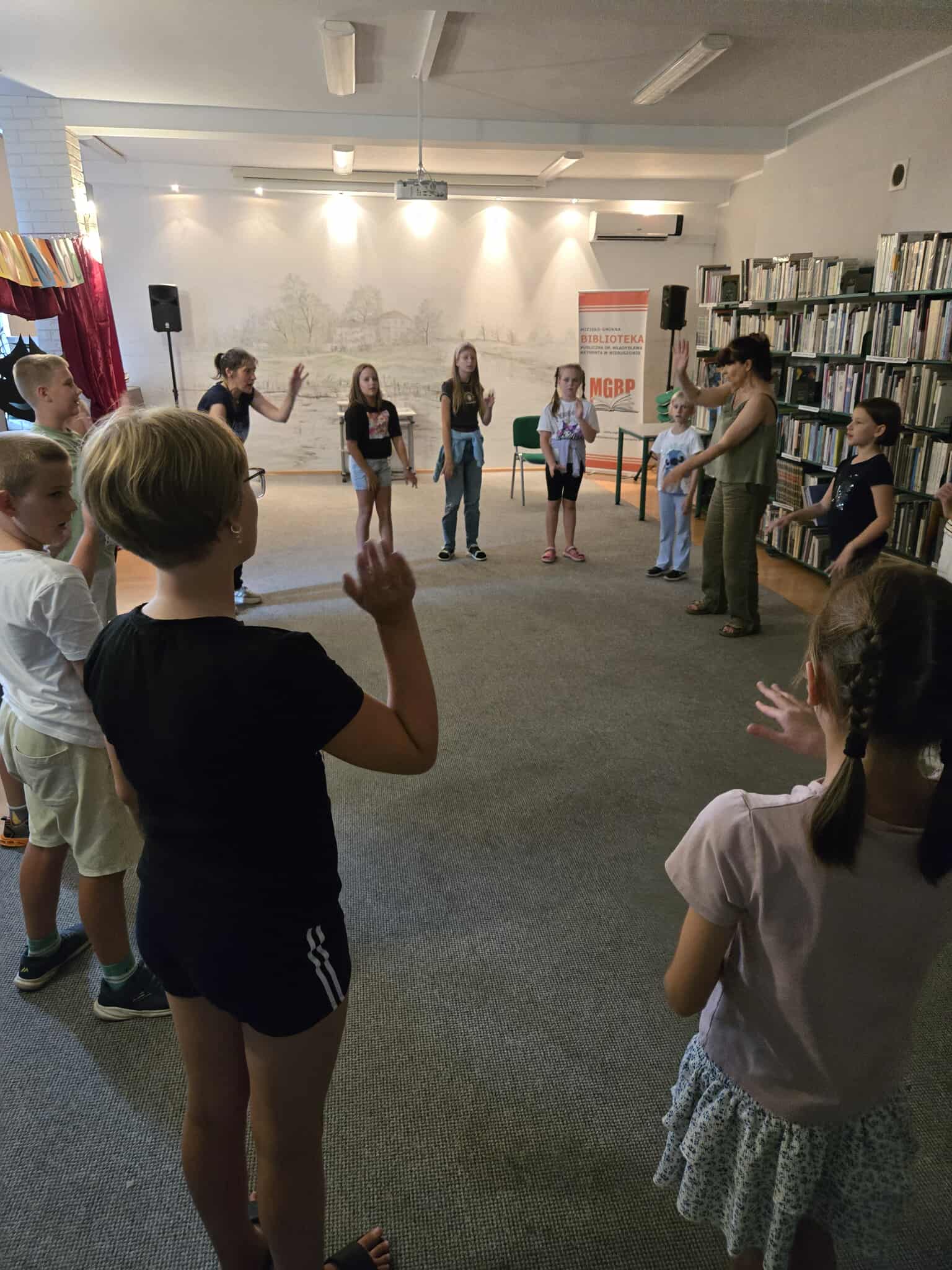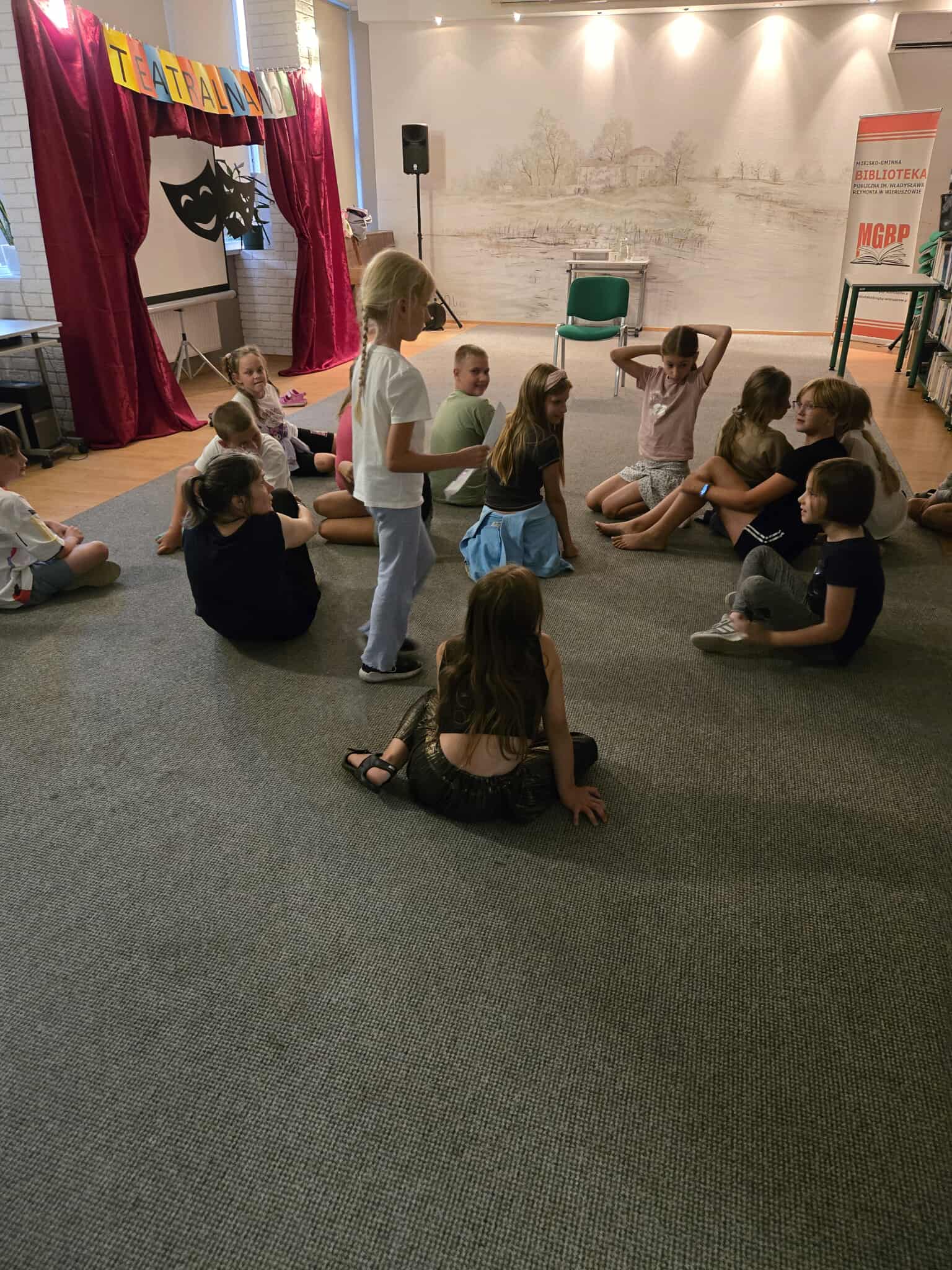 20/21sierpnia w Miejsko-Gminnej Bibliotece Publicznej w Wieruszowie po raz 9 odbyła się noc w bibliotece. Tym razem teatr odgrywał główną rolę. Teatralna noc rozpoczęła się o godz. 17:00 spektaklem pt. „Trzy świnki” w wykonaniu Ogólnopolskiego Teatru William-Es. Po przedstawieniu 15 osobowa grupa dziecięca miała możliwość uczestniczenia w warsztatach teatralnych prowadzonych przez aktorów ww. teatru. Dzięki tym zajęciom uczestnicy zajęć rozwijali swoje umiejętności związane z aktorstwem. Pod okiem doświadczonych instruktorów rozwijali swoją wyobraźnię oraz pracowali z tekstem i ruchem scenicznym. Z naszych obserwacji śmiemy stwierdzić, że dzięki tym zajęciom wiele dzieci przełamało swoje lęki i nieśmiałość oraz obudziło w nich poczucie własnej wartości i pewność siebie. Nocny spacer i kolacja w pizzerii szybko zintegrowała grupę. Po powrocie do biblioteki dzieci z pomocą bibliotekarek wykonały pacynki z skarpetek. Około godz. 23 dzieci zmęczone ale szczęśliwe słuchając bajki mogły wreszcie ułożyć się do snu. A czy zasnęły??? Nocne szepty ucichły po północy. Rankiem dzieci zjadły śniadanko i otrzymały pamiątkowe dyplomy oraz upominki z Gminy Wieruszów. Taka noc w bibliotece jest tylko raz w roku, ale kto w niej uczestniczy ten zapamięta ją na długo.